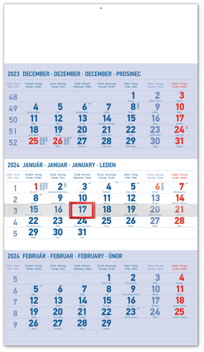 Nástenný kalendár 3-mesačný štandard modrý – so slovenskými menami 2024, 29,5 × 43 cm