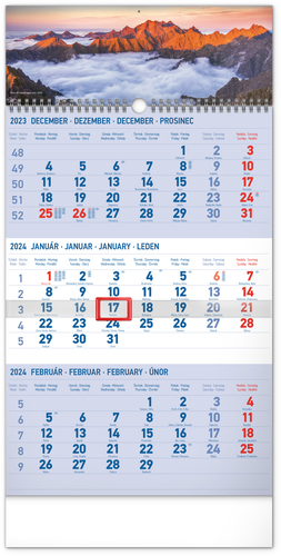 Praktický trojmesačný plánovací kalendár s náhľadom troch mesiacov súčasne a orientačnou lištou s posuvným jazdcom. Obsahuje kalendárium so slovenskými menami a svetovými sviatkami na svetlomodrom pozadí s obrázkom Tatier.