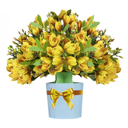 Přineste někomu do jeho výjimečného dne trochu slunečního svitu s naší úžasnou 3D Kyticí Žlutých Narcisů. Tato zářivá pop-up kytice s narcisy v blankytně modré váze se žlutou mašlí je krásným vyjádřením radosti, vřelosti a uznání, které zanechá trvalý dojem.