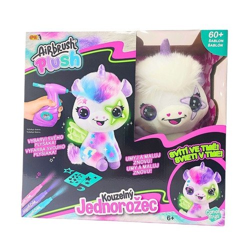 Navrhni a vybarvi si svého kouzelného jednorožce, který dokonce svítí ve tmě. Součástí tohoto balení je plyšové zvířátko, airbrush nástroj, 3 různé barevné náplně, 60 různých šablon a návod. Plyšové zvířátko si můžeš pomocí airbrushe libovolně posprejovat, můžeš využít různé barvy a šablony. Fantazii se meze nekladou. Pokud se ti vytvořený design přestane líbit, stačí plyšáka omýt vodou a můžeš začít znovu.