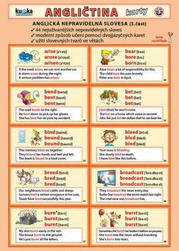 Karty k procvičování nepravidelných sloves včetně jejich užití ve větách. Třetí část obsahuje dalších 44 nejužívanějších nepravidelných sloves, záložku se všemi tvary sloves a gramatickou záložku slovesných časů.
