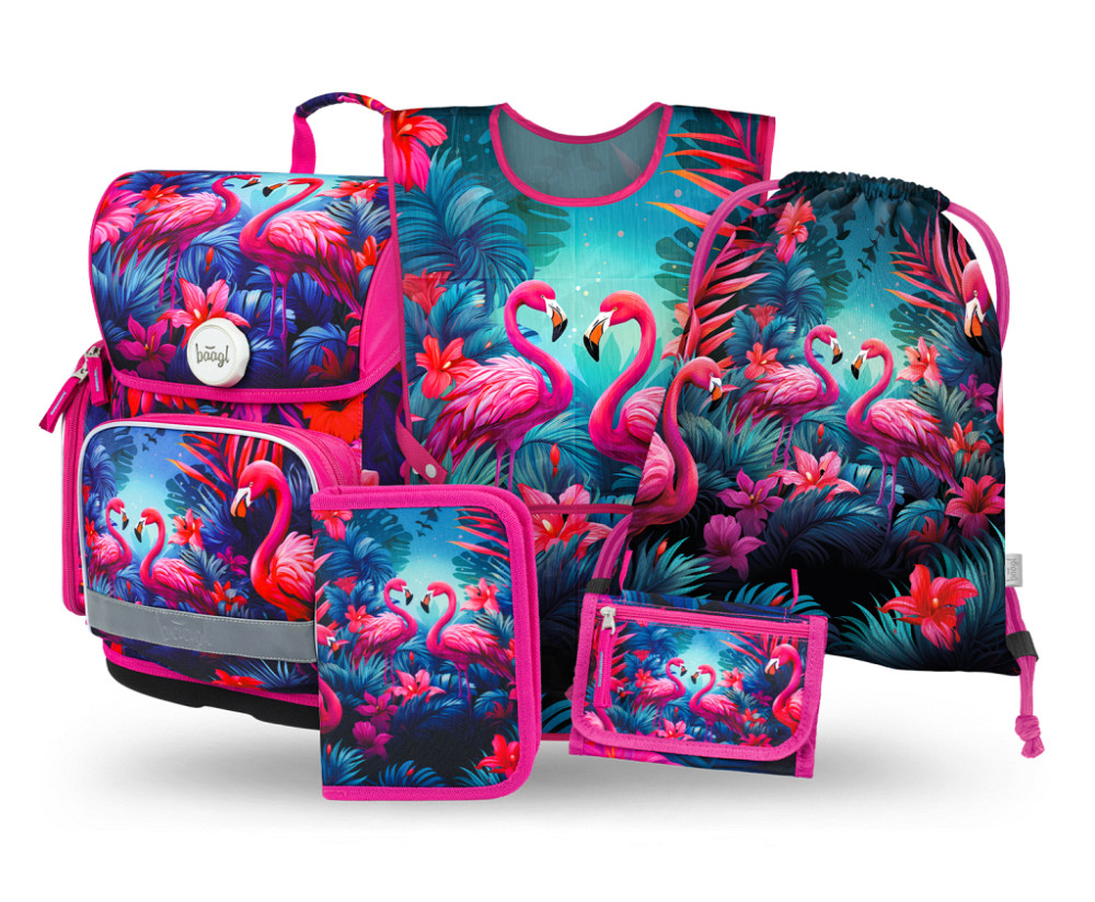 BAAGL SET 5 Ergo Plameňáci: aktovka, penál, sáček, zástěra, peněženka