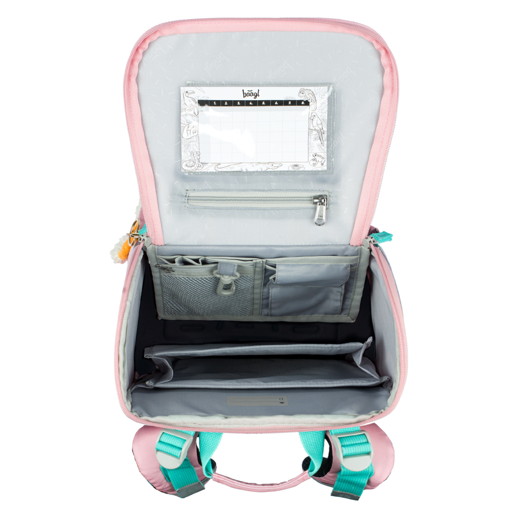 • Uvnitř aktovky je průhledná kapsa na rozvrh a vnitřní organizér umožňující rovnoměrné rozložení hmotnosti, doplněný gumičkou pro fixaci.