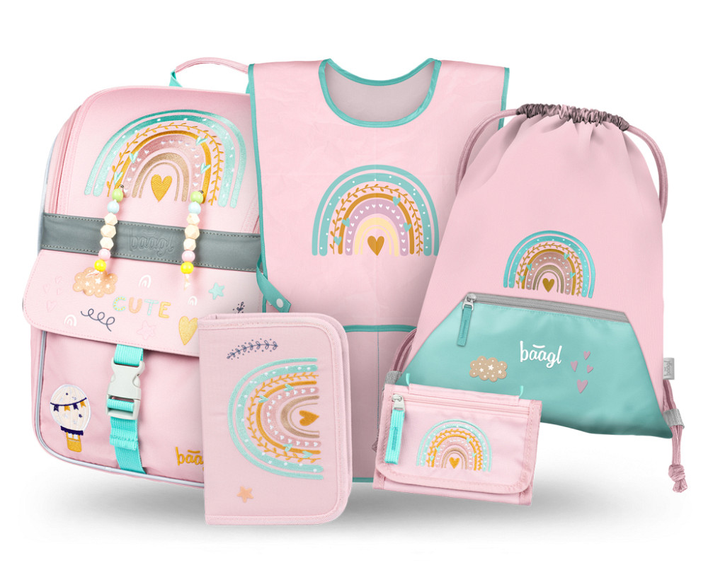 BAAGL SET 5 Zippy Duha růžový: aktovka, penál, sáček, zástěra, peněženka