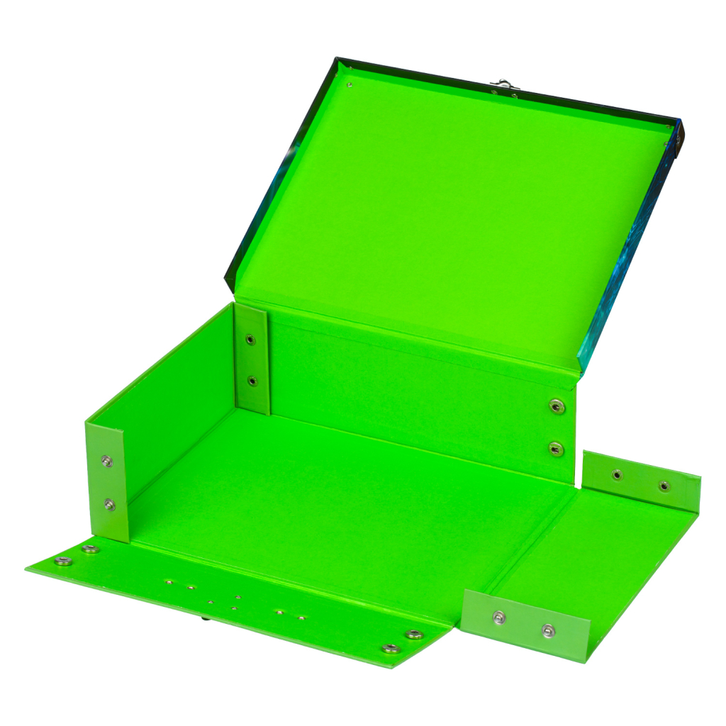 • Skládací kufřík z pevného laminovaného papíru s okovanými rohy.• Unikátní provedení s patentky, díky nimž se dají vždy znovu složit a rozložit.