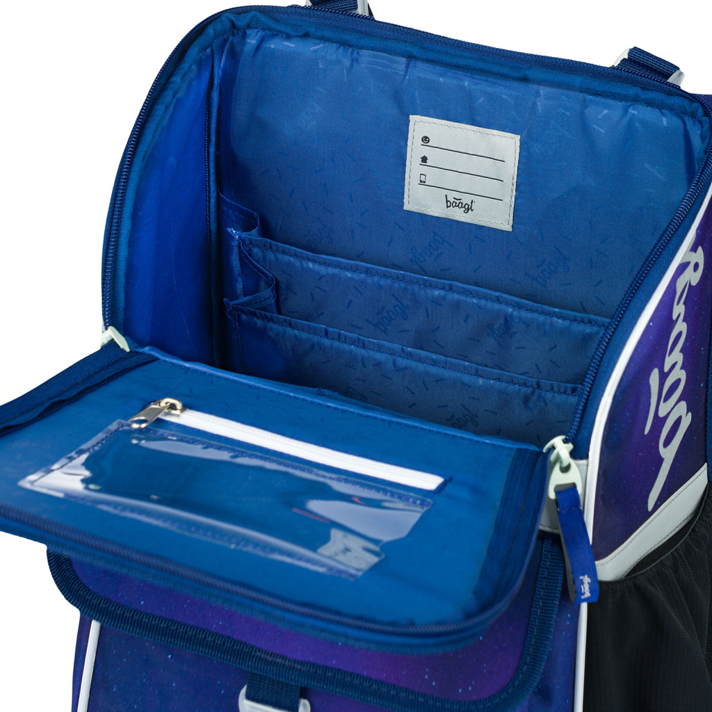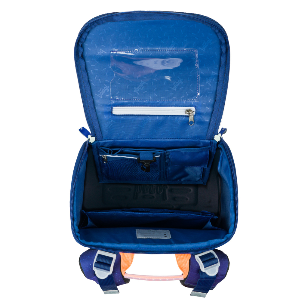 • Uvnitř aktovky je průhledná kapsa na rozvrh a vnitřní organizér umožňující rovnoměrné rozložení hmotnosti, doplněný gumičkou pro fixaci.