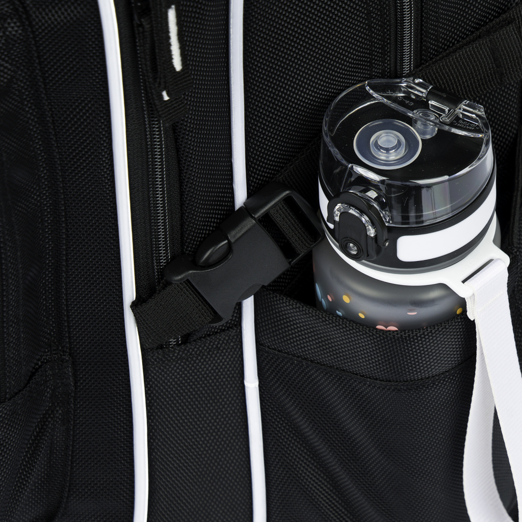 • Boční kapsy z pevného materiálu, které jsou vhodné pro jednu z našich láhví na pití.