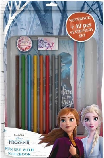 Balíčky obsahují základní kreslicí potřeby - ořezávátko, gumu, 2 tužky, 6 trojhranných pastelek a notes s gumičkou ve formátu A5, vše v praktickém sáčku s pohádkovým motivem.