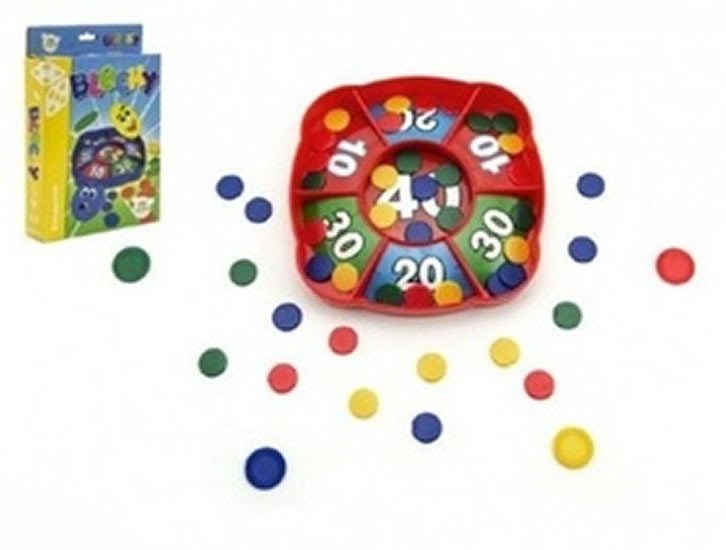 Úkolem je dostat všechny malé blechy pomocí té velké do přihrádek v krabičce, hra obsahuje 4 různobarevné sady koleček, vždy 5 malých a 1 velké