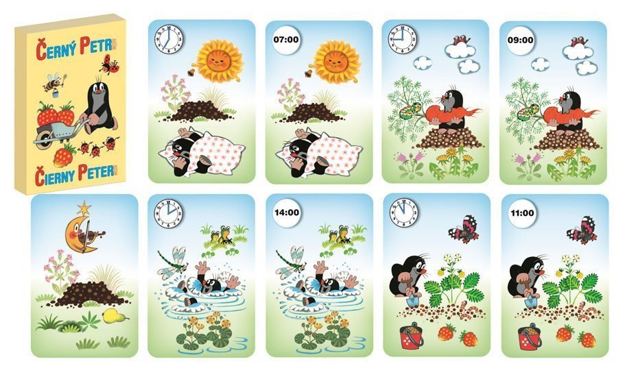 Černý Petr s motivem Krtečka Zdeňka Milera. Jako symboly při párování jsou uvedené časy (12-ti hodinový k 24 hodinovému a naopak), takže děti kromě párování shodných obrázků si procvičují i čas.