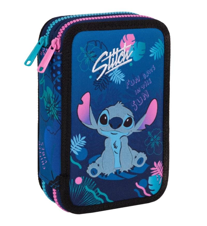 Dvoupatrový penál s výrazným a na omak hebkým motivem Stitche. Odolný zip je sladěný s kontrastním s lemováním. Pevné ploché gumičky na psací potřeby drží tvar a nevytahávají se. Plně vybavený. •materiál: 100 % polyester •obsahuje: 18 × fixa, 12 × pastelka, 1× trojhranná tužka HB, 1× gelový roller 0,7 mm, 1× pravítko 15 cm, 1 × pryž, 1 × ořezávátko