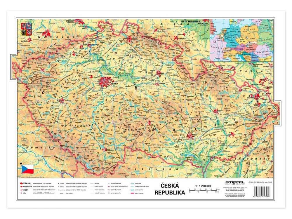 Obecně zeměpisná mapa České republiky patří do základní a nezbytné výbavy hodin zeměpisu a vlastivědy na ZŠ a ZVŠ. Od jejího prvního vydání v roce 1993 výrazně změnila kvalitu obsahu, byla aktualizována a především barevně upravena. Na mapě je také politická mapa střední Evropy. Legenda je rozšířená o údaje o zeměpisné poloze, rozloze a o významná nej... ČR. Zadní pracovní strana mapy nabízí široké využití na procvičování, zkoušení a popisování.