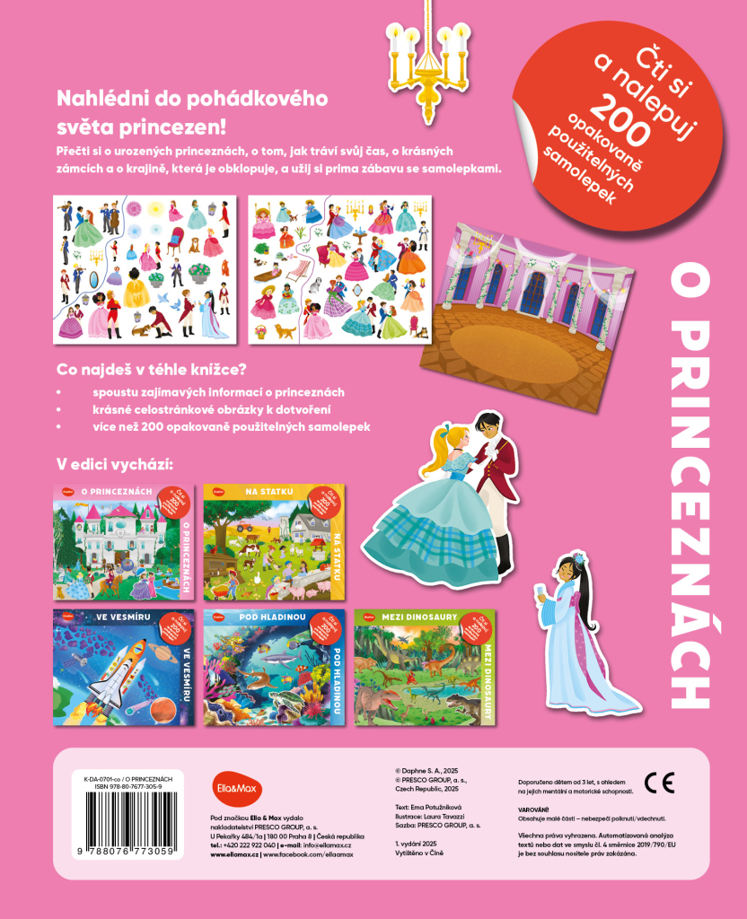 Užijte si spoustu zábavy s úžasnými adhezivními samolepkami, díky nimž stvoříte svůj vlastní pohádkový svět! V téhle knížce jich objevíte více než dvě stovky a můžete s jejich pomocí donekonečna dotvářet překrásné celostránkové obrázky, k nimž samolepky jednoduše přilnou. Vedle toho tu najdete také poutavý text plný zajímavých informací. Zavítáte do světa urozených princezen – navštívíte je v jejich zámeckých komnatách, projdete se s nimi romantickým parkem i okolní krajinou a přečtete si o tom, jak tráví svůj čas.