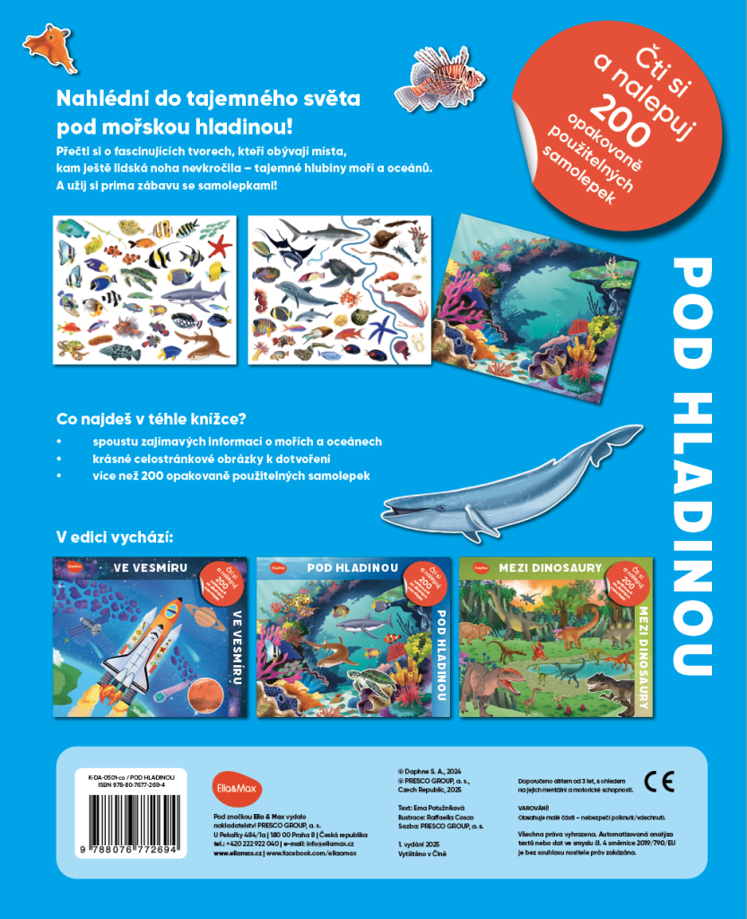 Užijte si spoustu zábavy s úžasnými adhezivními samolepkami, díky nimž stvoříte svůj vlastní podmořský svět! V téhle knížce jich objevíte více než dvě stovky a můžete s jejich pomocí donekonečna dotvářet překrásné celostránkové obrázky, k nimž samolepky jednoduše přilnou. Vedle toho tu najdete také poutavý text plný zajímavých informací o mořích a oceánech. Zavítáte do tajemného světa pod mořskou hladinou – dozvíte se o fascinujících tvorech, kteří obývají místa, kam ještě lidská noha nevkročila: neprozkoumané hlubiny slaných vod.