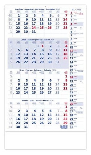 Formát kalendáře: 31,5 x 49 cm </br> Kalendárium: české čtyřměsíční s poznámkami, jmény a se svátky vybraných evropských států (CZ / SK / A / B / D / F / H / CH / I / PL / RUS / UKR) </br> Rozsah kalendáře: 12 listů </br> Prostor pro přítisk: 31,5 x 7 cm </br> Součástí celého balení je 20 kusů laší zdarma