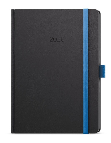 Neobyčejný denní diář s matným povrchem ze strukturovaného materiálu s modrou gumičkou a poutkem. Je vyráběný ve formátu A5, má velký prostor pro poznámky a plánování.