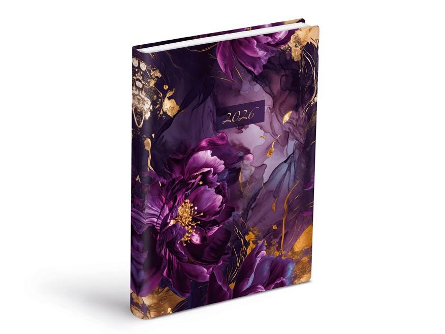 Temná elegance pro každý den! Denní diář 2026 ve formátu A5 spojuje praktičnost s uměleckým dojmem. Výrazný květinový motiv v odstínech fialové a zlaté dodává celému provedení luxusní, téměř mystický nádech. Povrch diáře je z měkkého, na dotek sametově hebkého materiálu (PU), který je odolný a příjemný při každodenním používání. Odtrhávací rožky zpříjemňují orientaci v diáři a umožňují rychlé nalistování aktuálního dne. Uvnitř najdete denní rozvržení s dostatkem prostoru na vše, co si potřebujete zapsat – od úkolů po myšlenky.