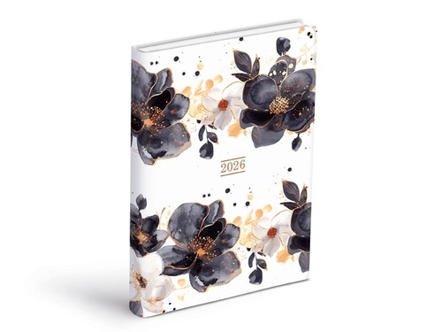 Styl, který vynikne – každý den v roce! Hledáte diář, který je nejen praktický, ale i vizuálně výjimečný? Tento denní diář pro rok 2026 ve formátu A5 okouzlí výrazným květinovým motivem v hlubokých tónech černé a šedé, doplněným o jemné zlaté detaily. Moderní a přitom nadčasový design se skvěle hodí pro každodenní použití i jako elegantní doplněk na stole. Měkčený povrch obálky (PU soft) je příjemný na dotek a odolný vůči opotřebení. Odtrhávací spodní rožky usnadňují rychlé nalistování aktuálního dne – praktický detail, který oceníte. Uvnitř najdete denní rozvržení, které poskytuje dostatek prostoru pro poznámky, schůzky i vaše osobní postřehy.