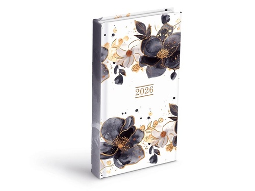 Váš průvodce rokem! Denní diář 2026 v sobě nese noblesu i lehkost. Jeho bílý podklad zdobí výrazné květy v černých a zlatavých tónech, doplněné o jemné detaily, které působí jako rozptýlený inkoust na akvarelovém papíře. Výrazný, romantický, ale s moderním nádechem. Obálka z matného lamina s parciálním lakem je nejen vizuálně atraktivní, ale také příjemná na dotek a odolná vůči každodennímu používání. Zlaté číslice 2026 decentně vystupují z designu a podtrhují jeho luxusní charakter. Kompaktní velikost umožňuje mít diář stále u sebe. Odtrhávací rožky slouží jako diskrétní vodítko, díky kterému se vždy snadno zorientujete.