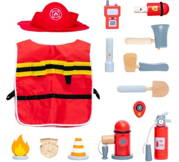 14dílná sada hasičského vybavení podporuje u dětí rozvoj logického myšlení a řešení problémů. Obsahuje vše, co malý záchranář ke své práci potřebuje, od helmy a megafonu pro svolávání týmu až po hydrant a hasicí přístroj, kterým obratně uhasí každý požár.