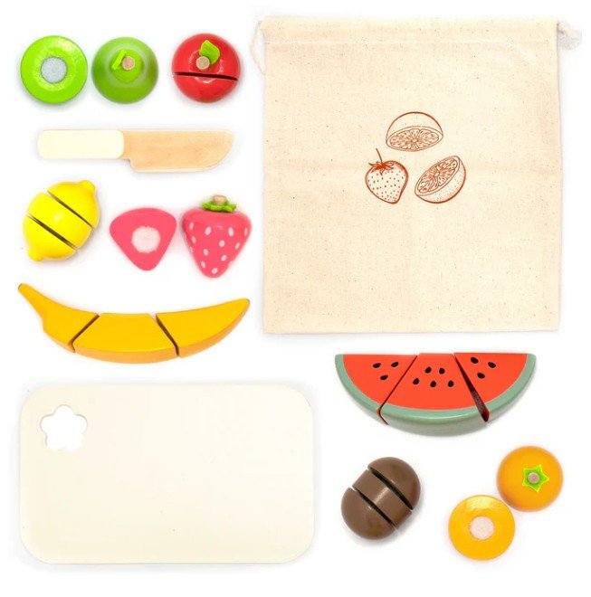 Dřevěné ovoce na krájení pro děti obsahuje 23 dílů potravin a doplňků do dětské kuchyňky.
