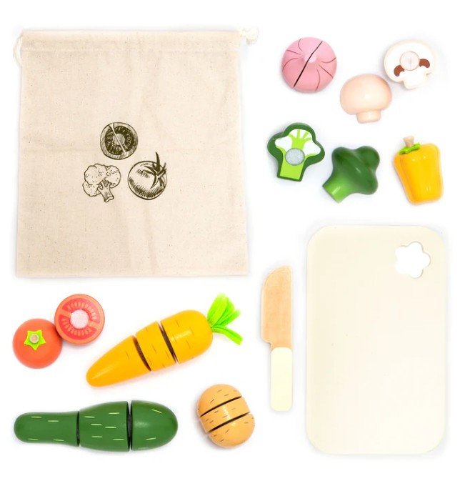 Dřevěná zelenina na krájení pro děti obsahuje 22 dílů potravin a doplňků do dětské kuchyňky.
