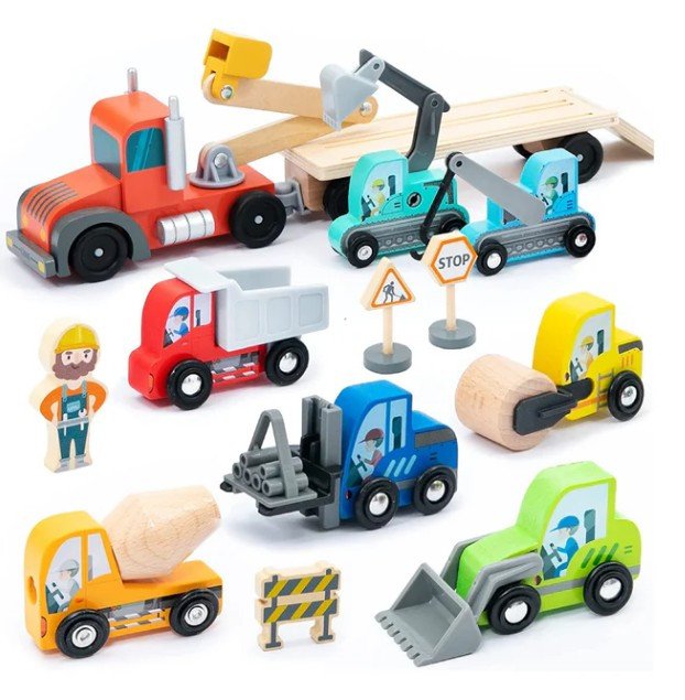 Dřevěný transportér stavebních vozidel pro děti kompatibilní se sadami železnic Brio World a dalšími značkami.
