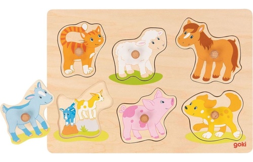 Barevná dětská vkládačka se šesti zvířátky ze statku.