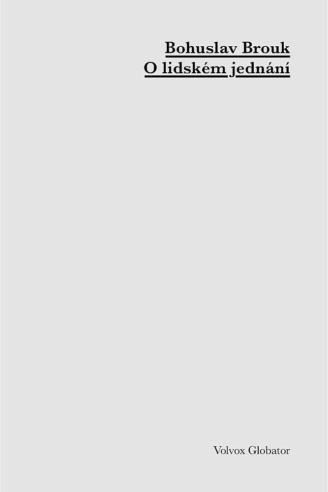 Úvaha O lidském jednání – věnovaná tématům svobodného rozhodování a svobodné vůle – představuje úvod spisu významného představitele kulturního života třicátých a čtyricátých let Bohuslava Brouka, na němž autor pracoval v letech 1954–1958 v Melbourne a Londýně a který zamýšlel předložit jako habilitační práci.