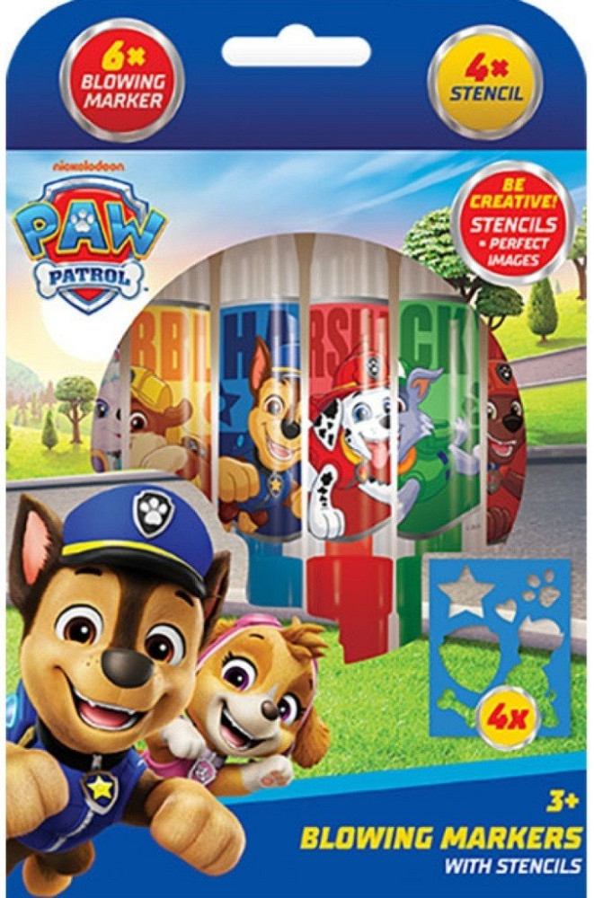 Balení obsahuje 6 barevných foukacích fixů s potiskem a 4 barevné papírové šablonky v oblíbených motivech.