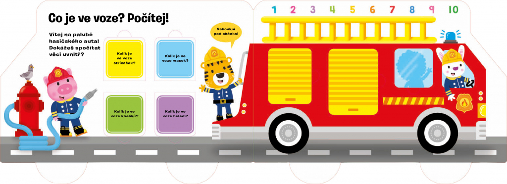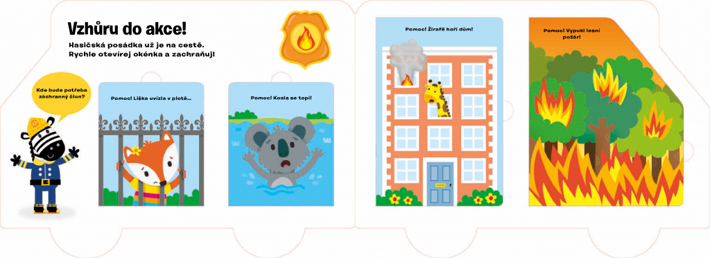 V tomto zábavném leporelu s veselými obrázky a více než 25 otevíracími okénky se děti seznámí s rozmanitou a záslužnou činností hasičů. Dozvědí se, co všechno ke své práci potřebují, v jakých situacích dokážou pomoct a jací další hrdinové-záchranáři s nimi spolupracují. Zároveň se procvičí v počítání nebo třeba v určování protikladů.