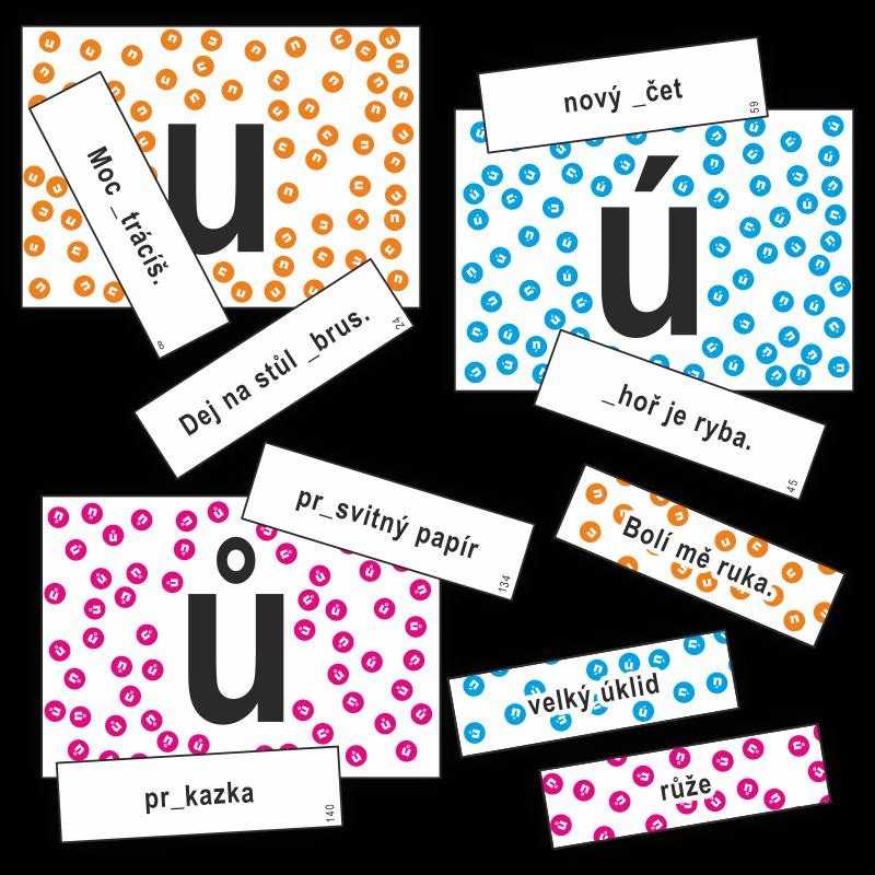 Samohlásky u-ú-ů - slovní spojení na kartičkách k procvičení psaní u/ú/ů