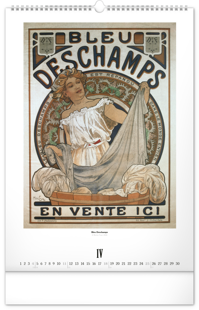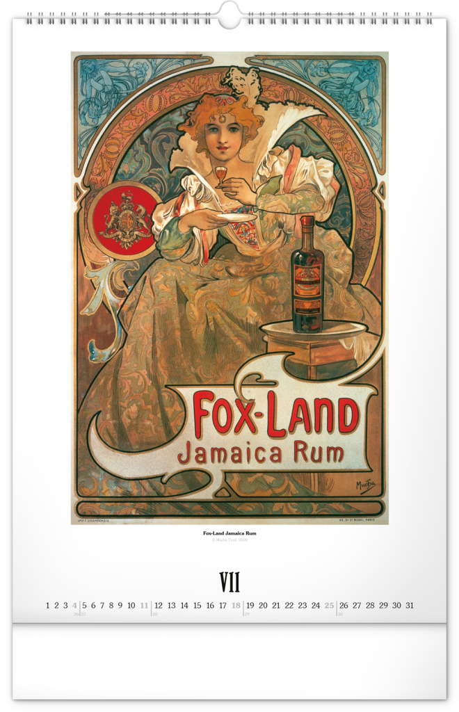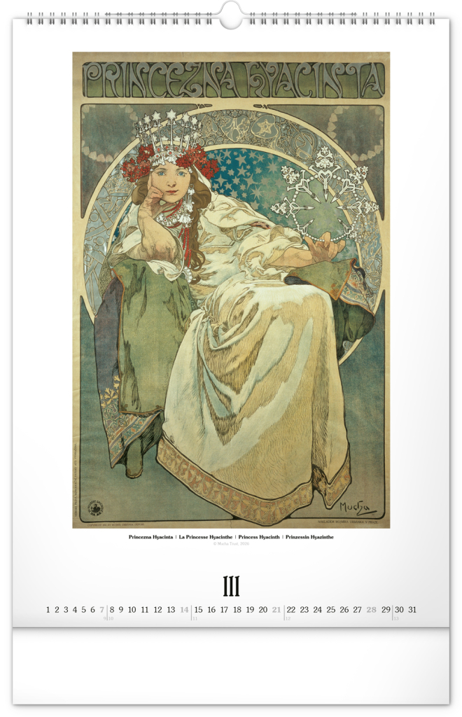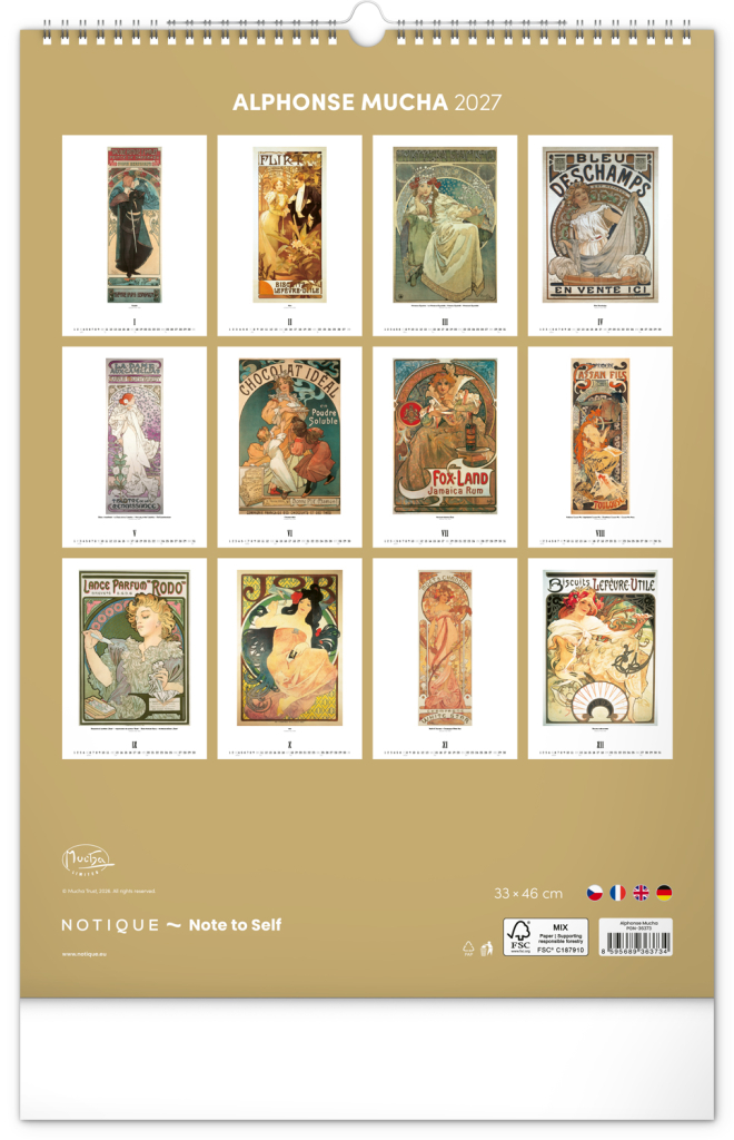 Nástěnný kalendář ve velkém formátu s reprodukcemi obrazů oblíbeného secesního malíře českého původu. Reprodukce doplňuje vkusné univerzální kalendárium s vyznačenými nedělemi a popisky děl ve čtyřech jazycích (CZ, FR, EN, DE).