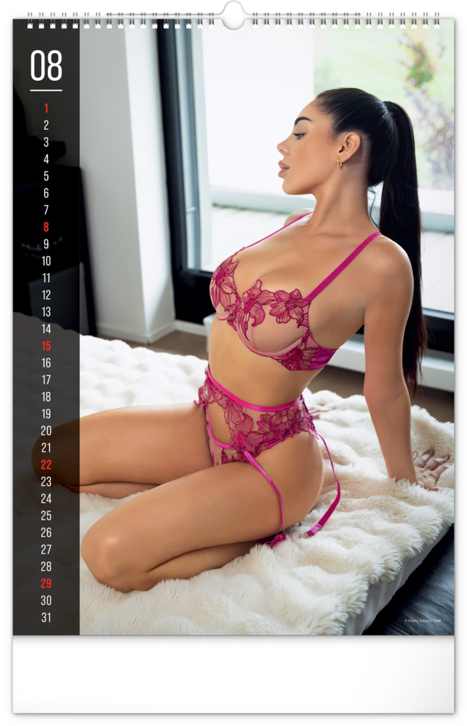 Exkluzivní akty krásných žen. Kalendář obsahuje jednoduché kalendárium se zvýrazněnými nedělemi na černém pozadí.