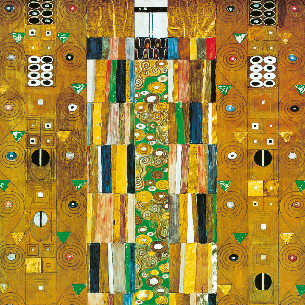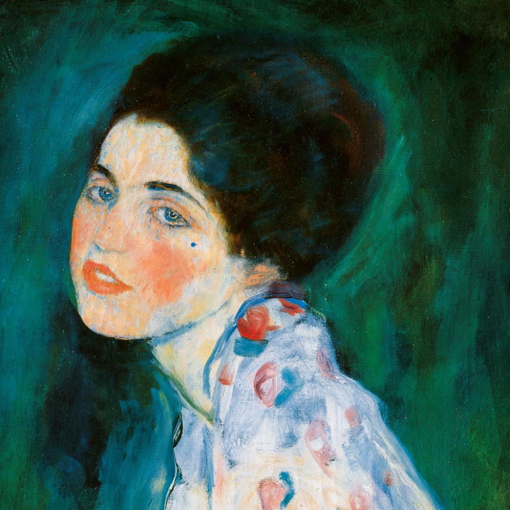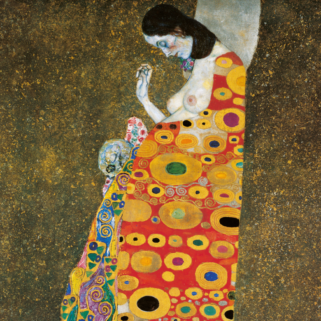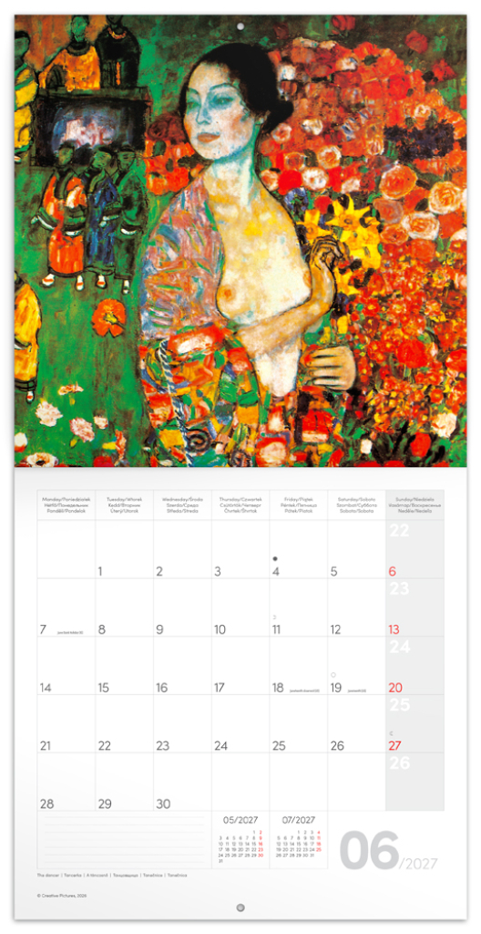 Obrazy populárního secesního malíře Gustava Klimta na stránkách poznámkového kalendáře. Ten obsahuje přehledné kalendárium od září 2026 do prosince 2027 v šesti jazycích, měsíční fáze, důležité svátky a prostor pro poznámky na každý den.