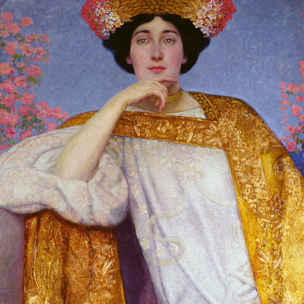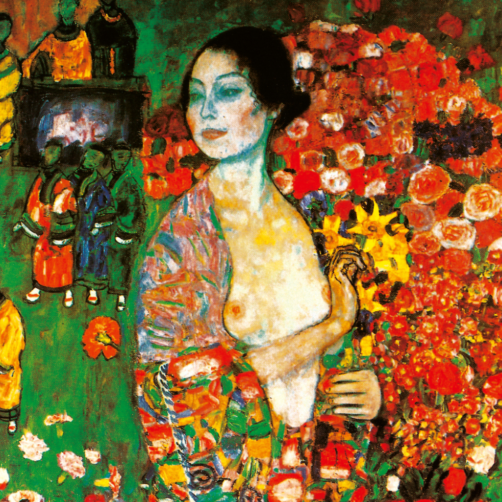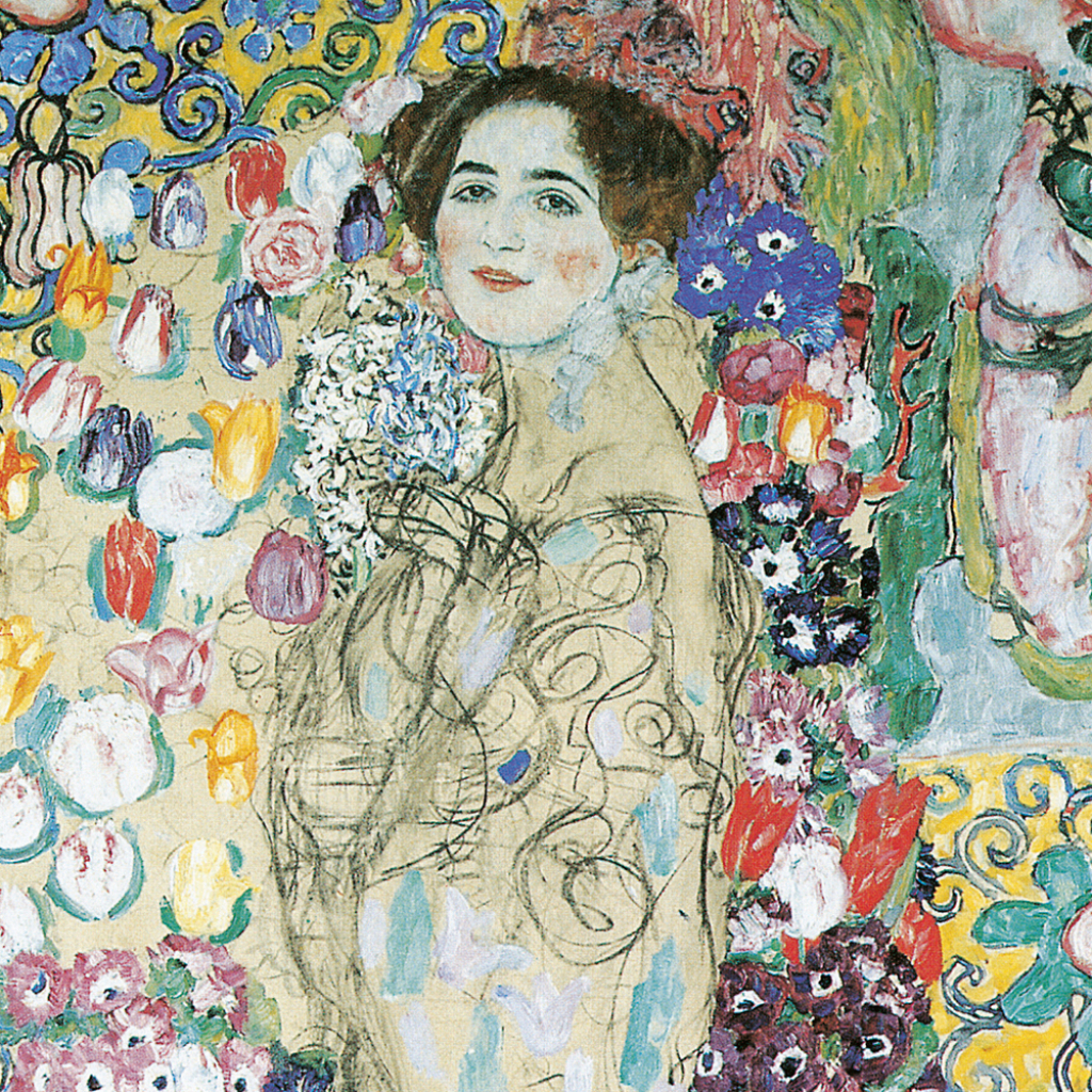 Obrazy populárního secesního malíře Gustava Klimta na stránkách poznámkového kalendáře. Ten obsahuje přehledné kalendárium od září 2026 do prosince 2027 v šesti jazycích, měsíční fáze, důležité svátky a prostor pro poznámky na každý den.