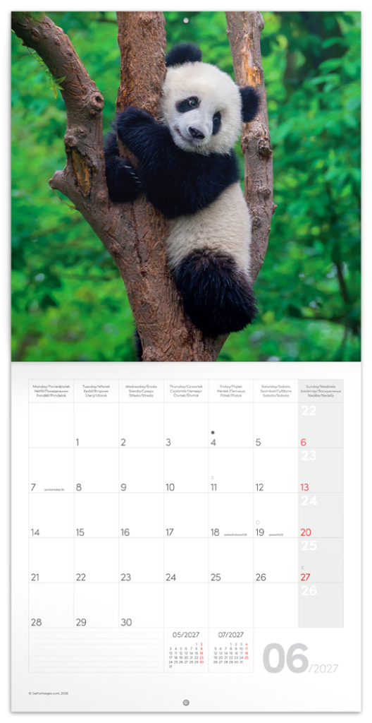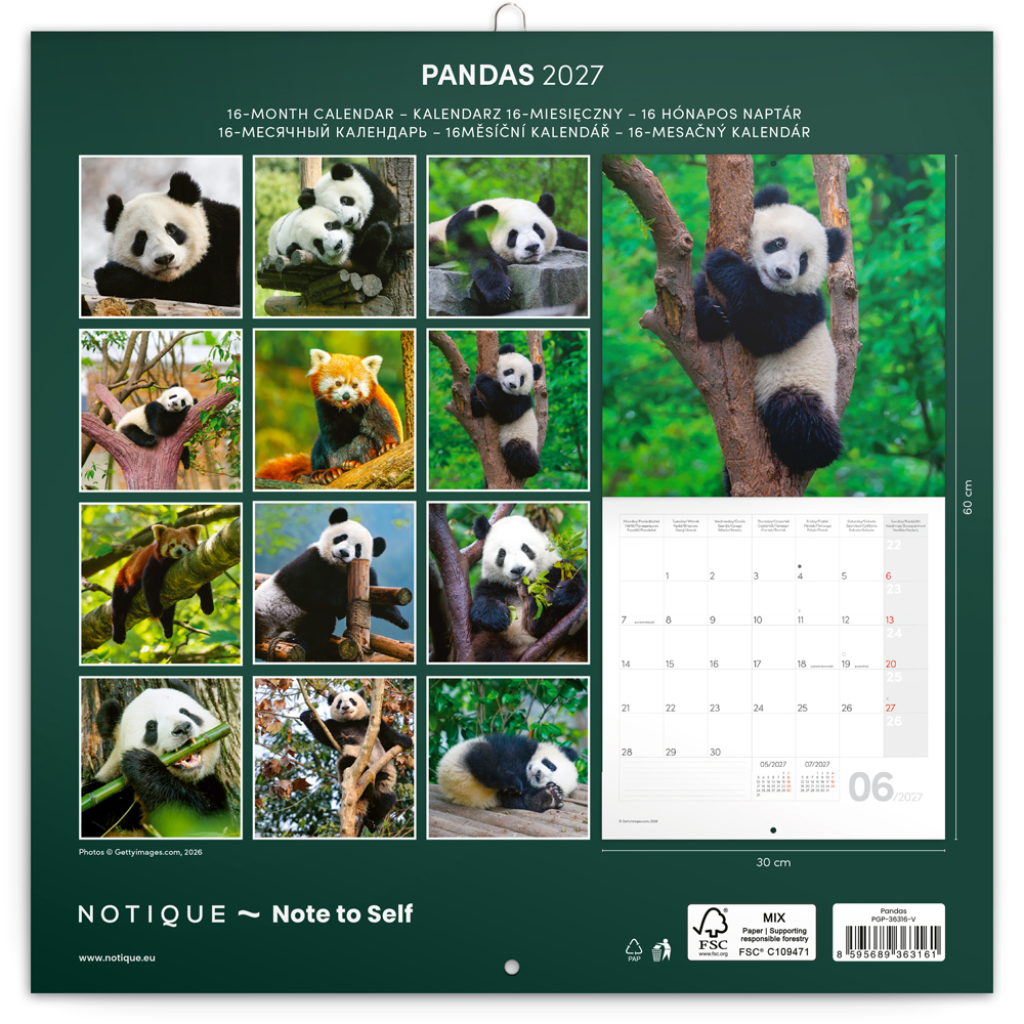Fotografie huňatých a nemotorných pand na stránkách poznámkového kalendáře vám vykouzlí úsměv na rtech. Uvnitř najdete přehledné kalendárium od září 2026 do prosince 2027 v šesti jazycích, měsíční fáze, důležité svátky a prostor pro poznámky na každý den.