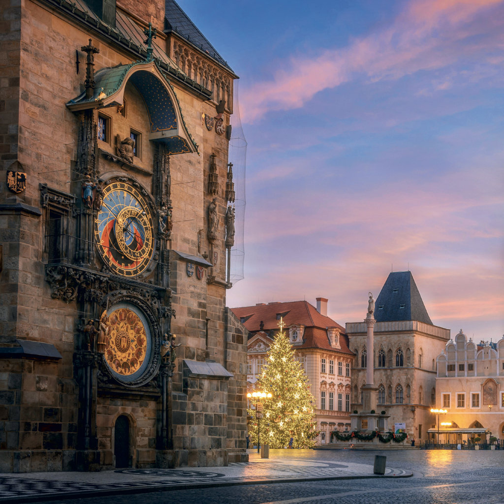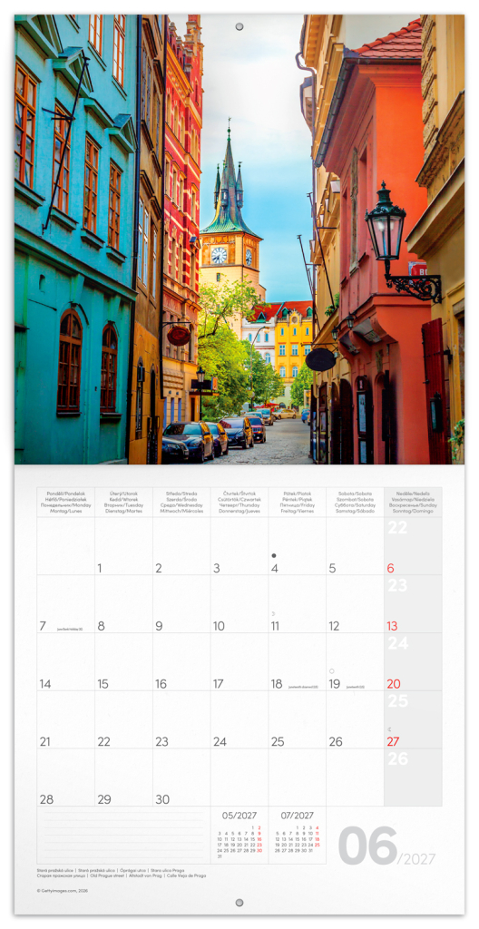 Poznámkový kalendář s nejznámějšími lokalitami v Praze obsahuje osmijazyčné kalendárium od září 2026 do prosince 2027, měsíční fáze a prostor pro poznámky na každý den.