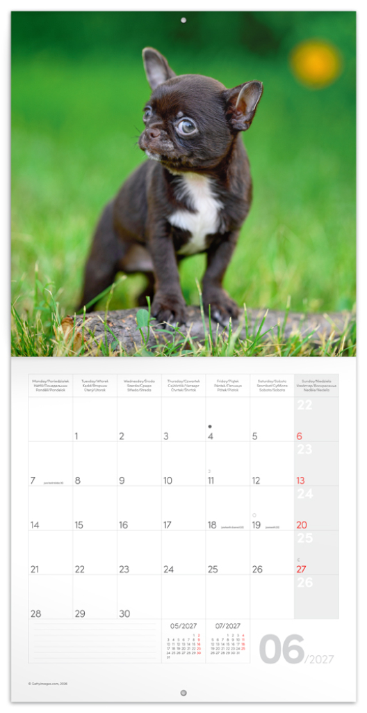 Roztomilá štěňátka na fotografiích v poznámkovém kalendáři. Uvnitř najdete přehledné kalendárium od září 2026 do prosince 2027 v šesti jazycích, měsíční fáze, důležité svátky a prostor pro poznámky na každý den.