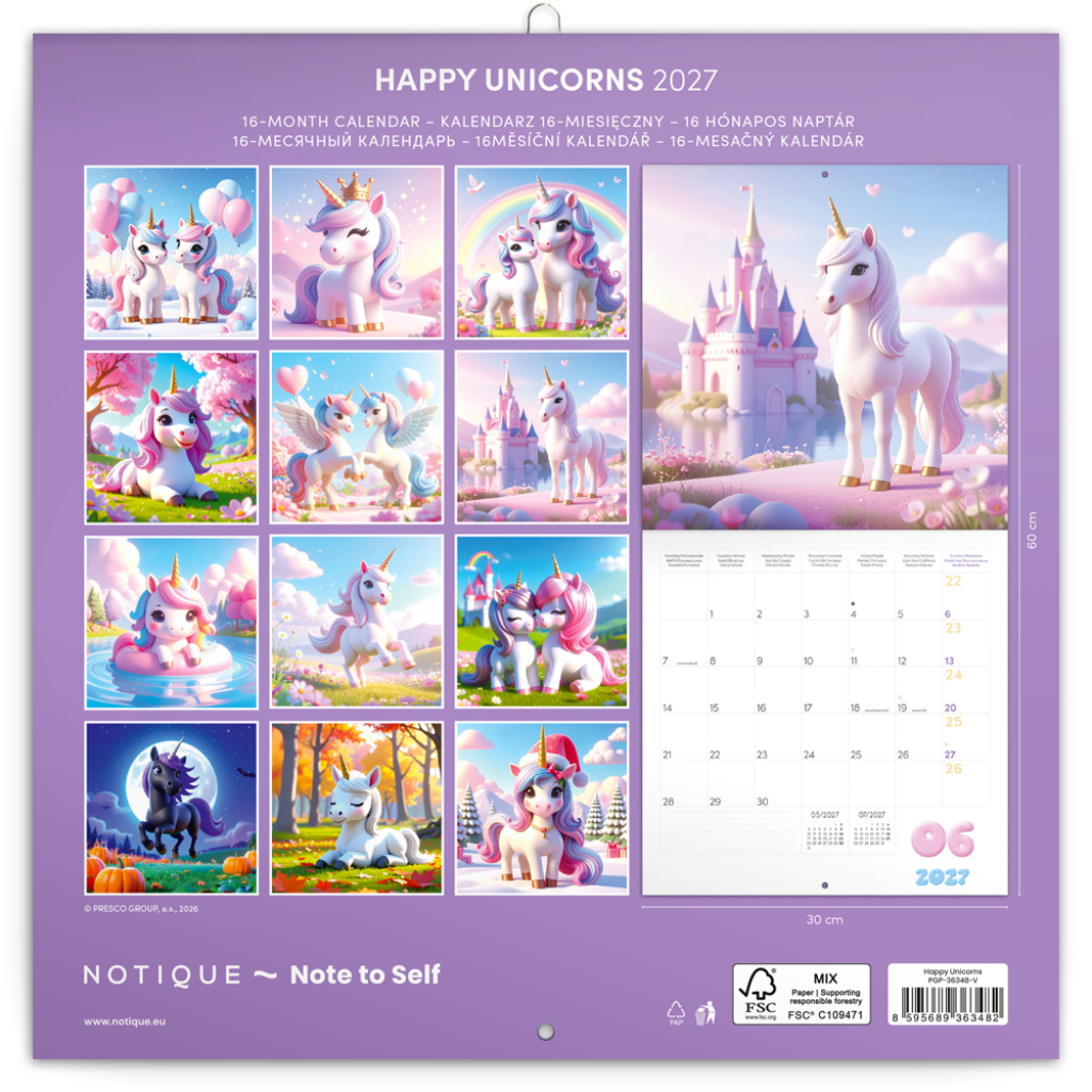 Poznámkový kalendář v pastelových barvách s motivem veselých jednorožců, kteří si užívají život naplno. Uvnitř najdete přehledné kalendárium od září 2026 do prosince 2027 v šesti jazycích, měsíční fáze, důležité svátky a prostor pro poznámky na každý den.