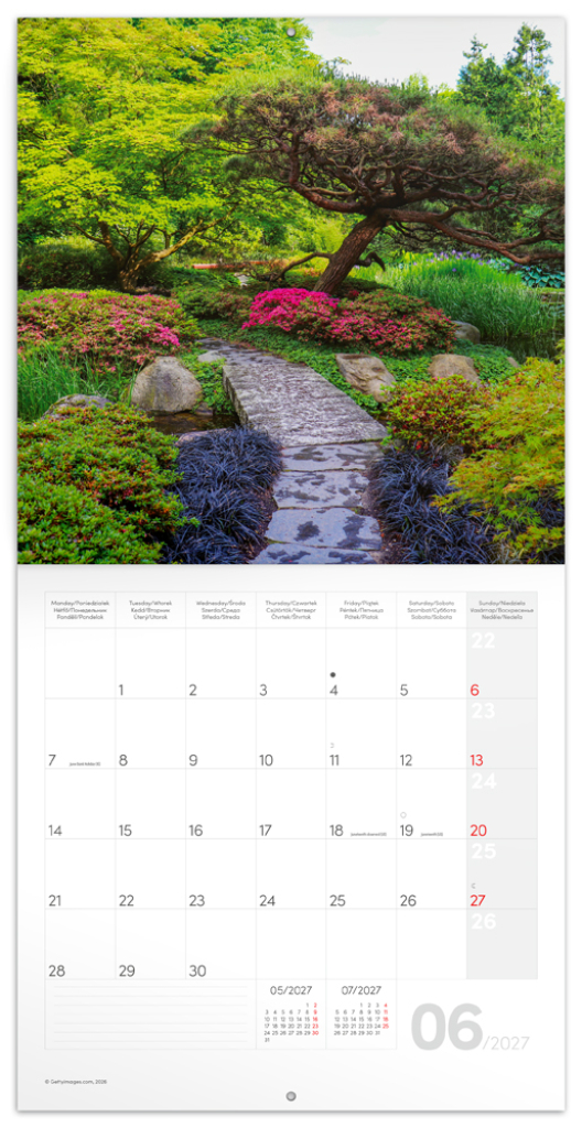 Rozjasněte svůj interiér barevnými fotografiemi šlechtěných zahrad. V kalendáři kromě fotek najdete přehledné kalendárium od září 2026 do prosince 2027 v šesti jazycích, měsíční fáze, důležité svátky a prostor pro poznámky na každý den.