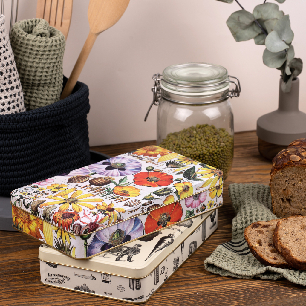 Stylové dóza Luční květiny z kolekce Kateřiny Winterové. Tato dóza má všestranné praktické využití. Můžete do ní uložit vánoční cukroví či jiné potraviny, nejrůznější poklady nebo drobnosti. Dóza je vyrobena ze 100% oceli s cínovou vrstvou.