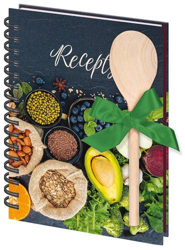 Nová kniha na recepty s vařečkou obsahuje úplně nové zpracování vnitřních listů. Stránky jsou linkované bez popisků. Každých 8 listů je rozděleno papírovým rozdělovníkem, který je možno si popsat druhem receptu. Kniha na recepty obsahuje celkem 10 rozdělovníků. Kniha s boční dvojitou spirálou a velmi kvalitním pevnými deskami je perfektní jako dárek pro vášnivé kuchaře a kuchařky, které si chtějí uchovat svoje nejlepší recepty. Na úvodních deskách je mašlí připevněna vařečka, kterou lze používat při vaření, místo ní si pak můžete připevnit např. tužku na psaní receptů.