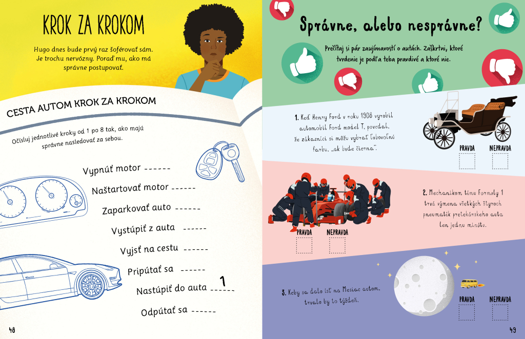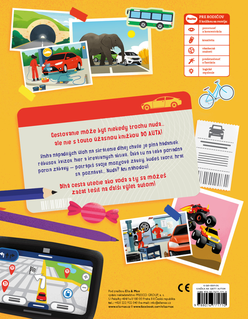 Cestování může být někdy trochu otrava… ovšem ne s touhle úžasnou knížkou DO AUTA, která je plná nápaditých úkolů k ukrácení dlouhých chvílí! Najdete v ní spoustu hádanek, zapeklitých rébusů, zábavných kvízů, her, kreativních aktivit i zajímavých informací z oblasti cestování autem. Čeká tu na vás pořádná porce zábavy – potrápíte své hlavičky, budete tvořit, hrát si, poznávat… Nuda? Nehrozí! Dlouhá cesta autem uteče jako nic a vy můžete začít vyhlížet další výlet! Práce s knihou navíc rozvíjí představivost, fantazii a kreativitu, ale také pozornost, koncentraci a logické myšlení.| EAN | 9788076771710 |