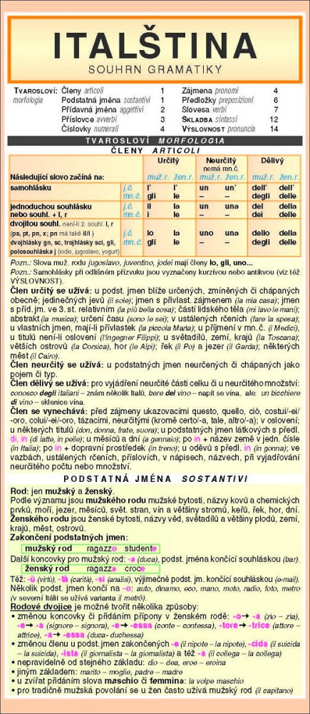 Koncentrovaný přehled sumarizuje učební látku – tvarosloví, skladba, výslovnost. Přehledné členění, grafická úprava a volba barev umožňuje rychlou orientaci v textu a snadnější zapamatování.