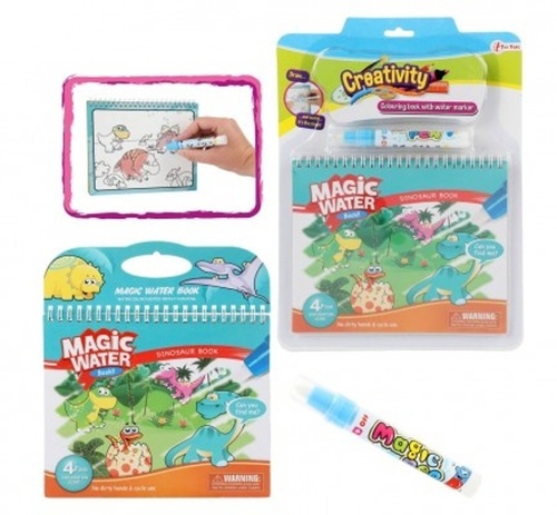 Čisté malování! Tyto "vodní" omalovánky obsahují čtyři znovupoužitelné obrázkové stránky a znovuplnitelné vodní pero. Použijte vodní pero, jehož tahy se zobrazí barvy na jednotlivých obrázcích, po uschnutí stránky obrázek opět zmizí. Omalovánky obsahují čtyři obrázky s motivy dinosaurů. Žádná špína a použitelné znovu a znovu.