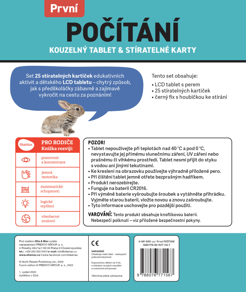 Set 25 stíratelných kartiček obsahujících 50 edukativních aktivit, přiložený fix s houbičkou a kouzelný tablet – to je pro rodiče ten nejrafinovanější a pro děti ten nejzábavnější způsob, jak společně vykročit na cestu za poznáváním čísel a prvních počtů! Práce s výukovými kartičkami a tabletem rozvíjí pozornost a koncentraci, jemnou motoriku, matematické schopnosti, logické myšlení a v neposlední řadě všeobecné znalosti!