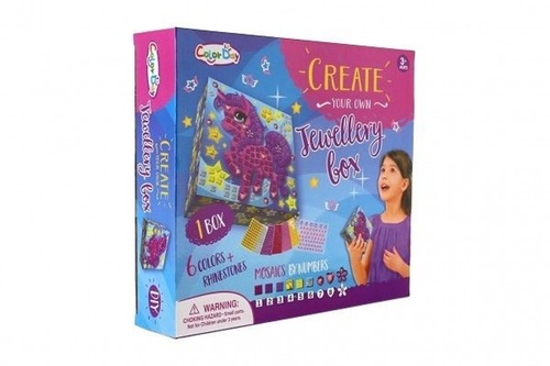 Kreativní šperkovnice s jednorožcem, kterou si můžete sami vyzdobit mozaikou pomocí přiložených třpytivých dílků. Jednotlivé dílky se nalepí na políčka s vyobrazenými čísly. Balení obsahuje: šperkovnici, 300 pěnových samolepek, 58 třpytivých kamínků.