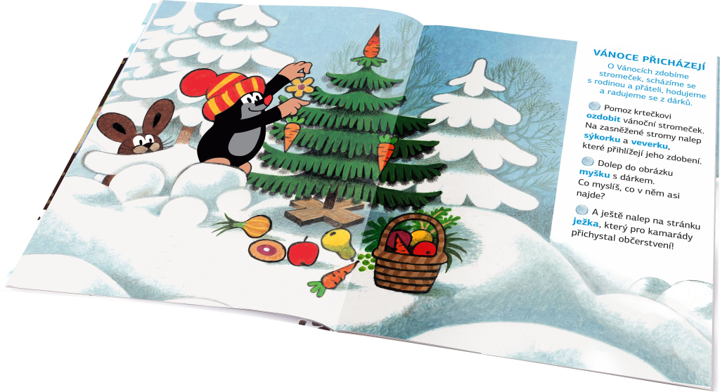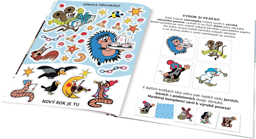 Dvoustránkové scenerie mohou děti dolepovat spoustou roztomilých samolepek, ať už podle zadání, anebo podle vlastní fantazie. V knížce se kromě toho dozvědí mnoho nového a zajímavého o zimě a za pomoci samolepek si také mohou vyzdobit vlastní obrázek, pokojíček nebo vyrobit pexeso!