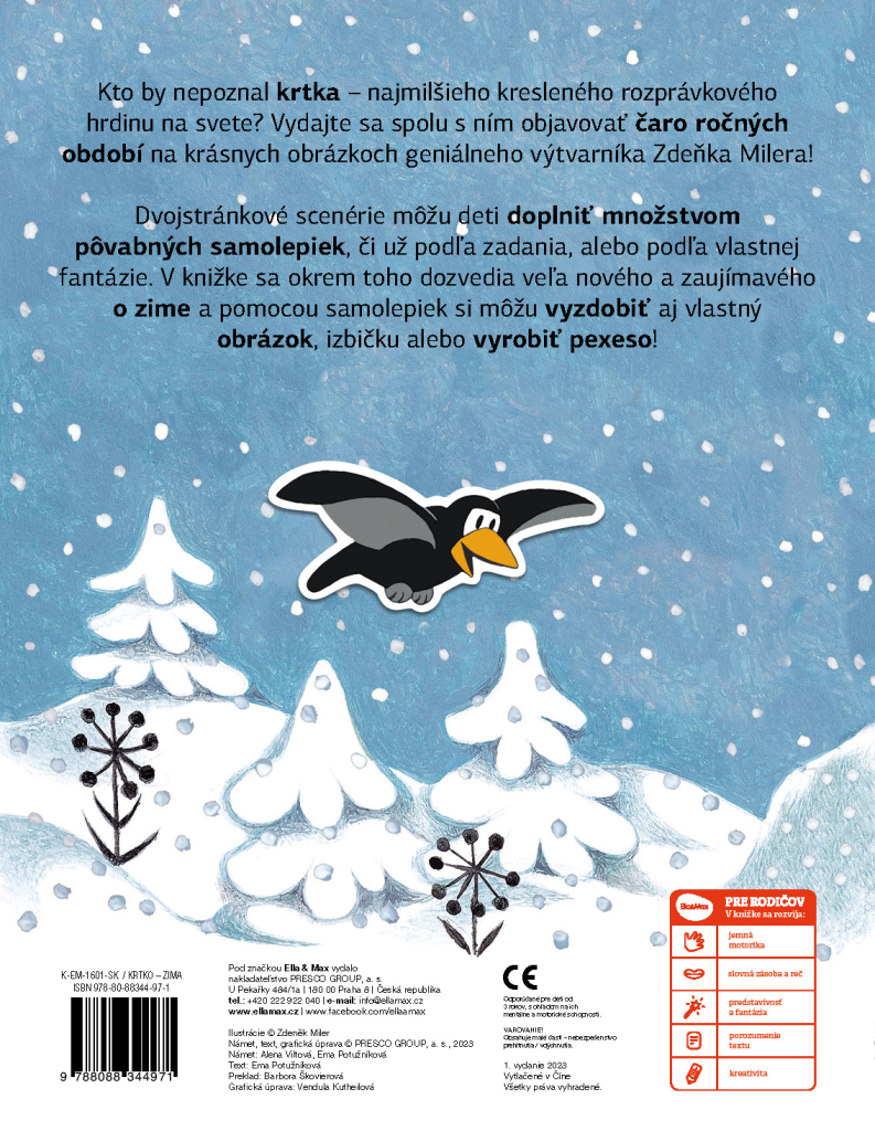 Kdo by neznal krtka – nejroztomilejšího kresleného pohádkového hrdinu na světě? Vydejte se spolu s ním objevovat kouzlo ročních období na krásných obrázcích geniálního výtvarníka Zdeňka Milera! Dvoustránkové scenerie mohou děti dolepovat spoustou roztomilých samolepek, ať už podle zadání, anebo podle vlastní fantazie. V knížce se kromě toho dozvědí mnoho nového a zajímavého o zimě a za pomoci samolepek si také mohou vyzdobit vlastní obrázek, pokojíček nebo vyrobit pexeso!| EAN | 9788088344971 |